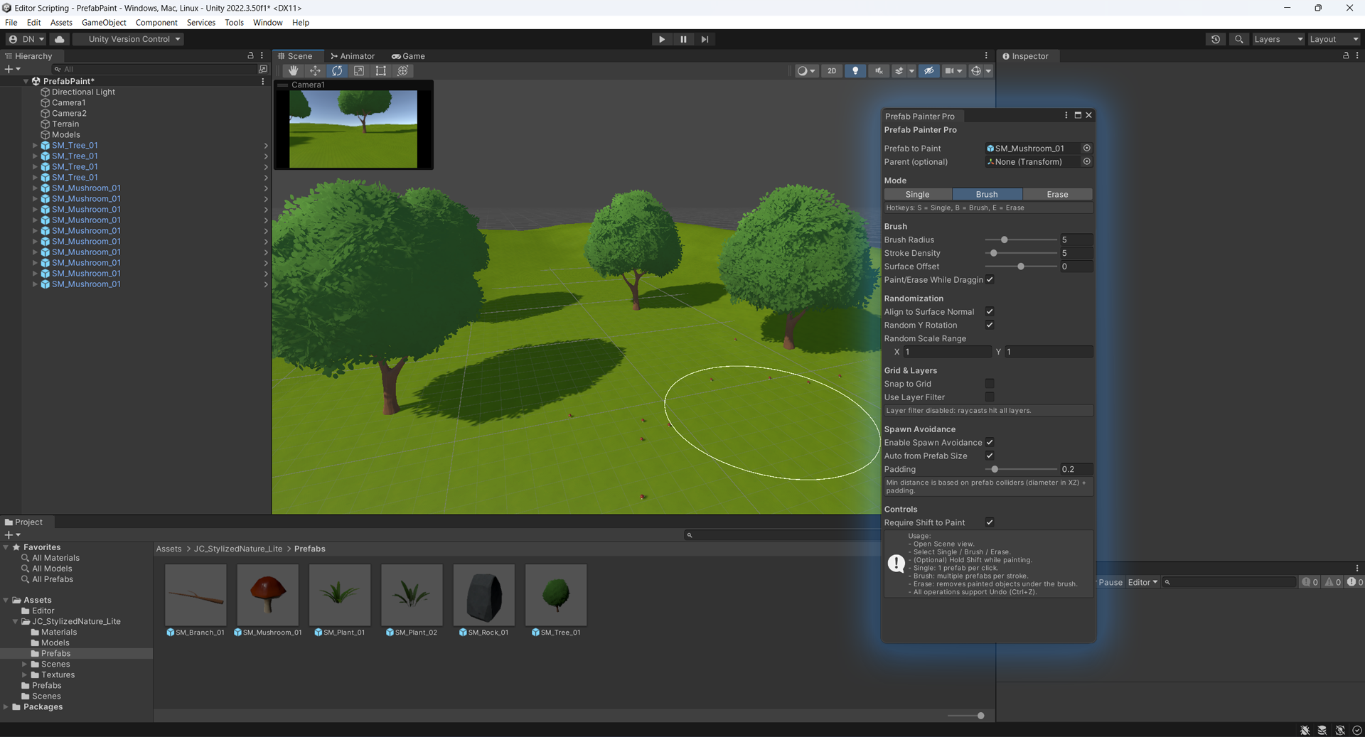 Brush Mode — distribute multiple prefabs inside a circular brush area